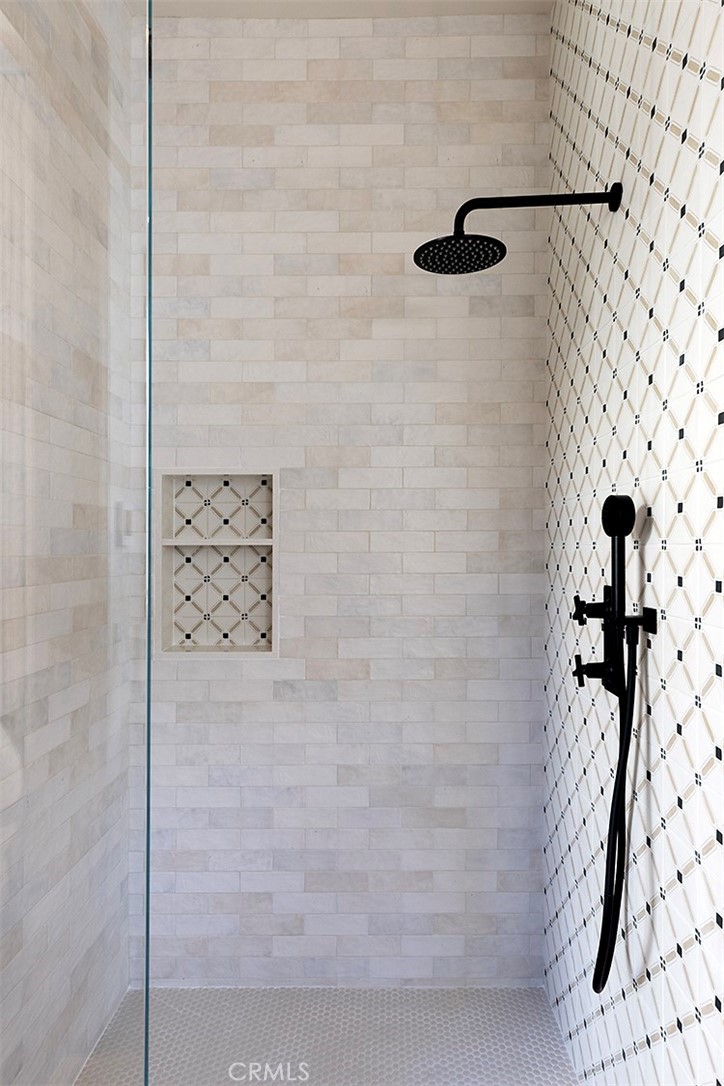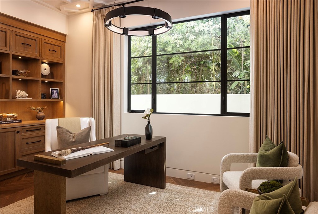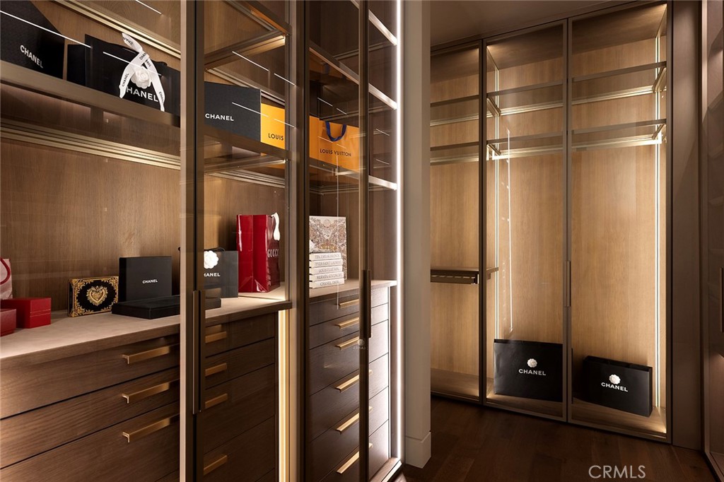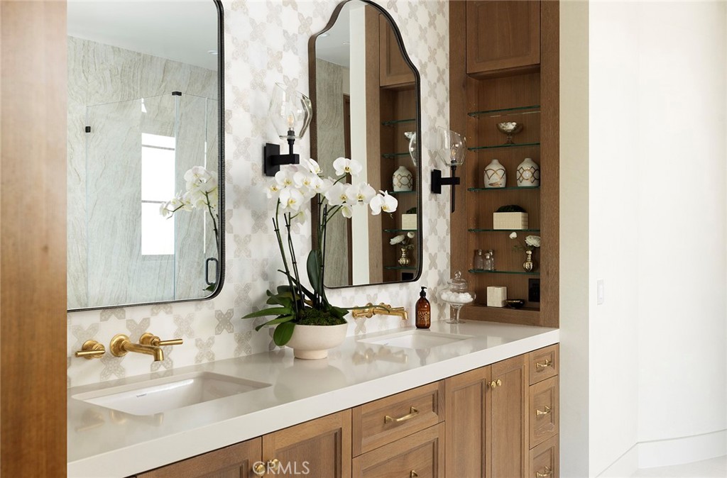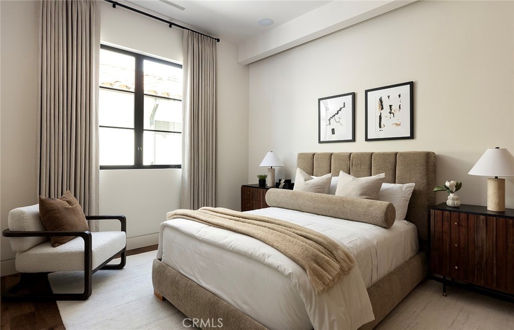 Each of the home's bathrooms exudes luxury, with handcrafted tiles, Waterworks burnished brass fixtures, and high-end TOTO washlets. The primary suite is a true sanctuary with custom white oak beams, and a Nero Lactea marble fireplace mantle, and custom his and hers walk-in closets imported from Italy that rival most designer showrooms.